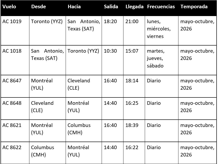 «Air Canada lanzará servicios a San Antonio y conectará Columbus y Cleveland con Montréal para facilitar los viajes entre estos destinos y los puntosa lo largo de nuestra red global. También aumentaremos la capacidad en otros mercados para ofrecer más opciones de viaje a los pasajeros en ambos lados del Atlántico», mencionó Mark Galardo, Vicepresidente Ejecutivo, Director Comercial y Presidente de Carga de Air Canada.