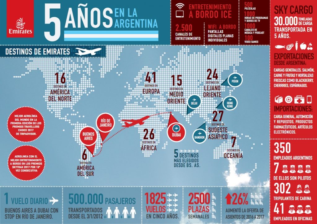 La compañía aérea Emirates celebra en 2017 su 5to.aniversario volando diariamente entre Buenos Aires y Dubái, con stop en Rio de Janeiro. Desde su arribo el 3 de enero de 2012, la llegada de Emirates al mercado argentino es el reflejo de una historia de consolidación, superación e incremento de su capacidad.