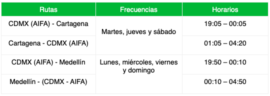 Estas rutas se suman a Bogotá como las opciones que Viva ofrece desde el AIFA hacia Colombia. La ruta a Cartagena iniciará operaciones el 4 de junio de 2026 con tres frecuencias semanales los días martes, jueves y sábados. La ruta hacia Medellín comenzará a operar un día después, el 5 de junio, con cuatro frecuencias semanales los lunes, miércoles, viernes y domingos. Los pasajeros interesados en visitar estos destinos ya pueden adquirir sus boletos desde la página web, la app y otros canales de venta oficiales de Viva.