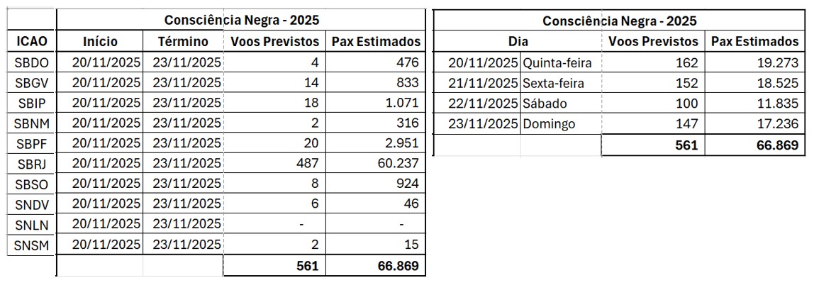 As previsões foram elaboradas com base nas programações informadas pelas companhias aéreas. Não houve comparação com a movimentação registrada em 2024, visto que, no ano passado, o dia 20 de novembro caiu em uma quarta-feira.