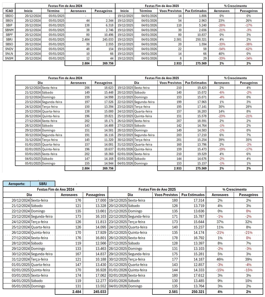 Segundo estimativas da Companhia, nos 17 dias, de 19/12/2025 a 4/1/2026, um total de 275.569 passageiros deve passar pelos 10 aeroportos, em 2.933 voos. Em 2024, de 20/12 a 5/1, foram registrados 269.756 passageiros e 2.884 voos, nos 10 terminais. Além do Aeroporto Santos Dumont, com 250.321 passageiros previstos, os terminais com maior movimento no período devem ser o Aeroporto de Passo Fundo (RS), com 10.837 passageiros, e o Aeroporto Vale do Aço, em Ipatinga (MG), com 5.240 passageiros.