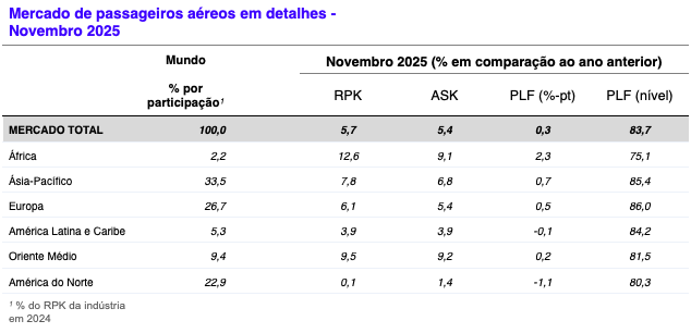 A Associação de Transporte Aéreo Internacional (IATA) divulgou dados sobre a demanda global de passageiros em novembro de 2025, com os seguintes destaques:
