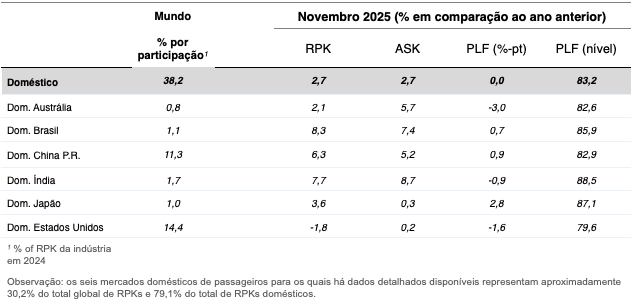 Os RPKs domésticos cresceram 2,7% em relação a novembro de 2024, e a taxa de ocupação manteve-se estável em 83,2%, sustentado por uma expansão de capacidade de 2,7%. Brasil e Índia foram os mercados com crescimento mais acelerado. O tráfego doméstico nos Estados Unidos foi o único grande mercado a registrar queda na demanda, possivelmente em razão da paralisação do governo.
