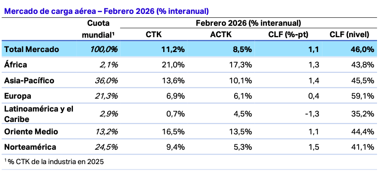 La Asociación de Transporte Aéreo Internacional (IATA, por sus siglas en inglés) ha publicado los resultados de los mercados mundiales de carga aérea correspondientes a febrero de 2026, entre los que destacan los siguientes resultados: