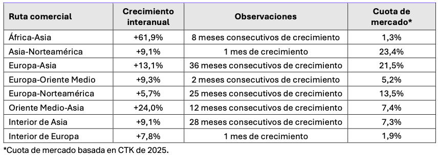 Los volúmenes del transporte aéreo de carga aumentaron en febrero de 2026 en todas las rutas comerciales principales.