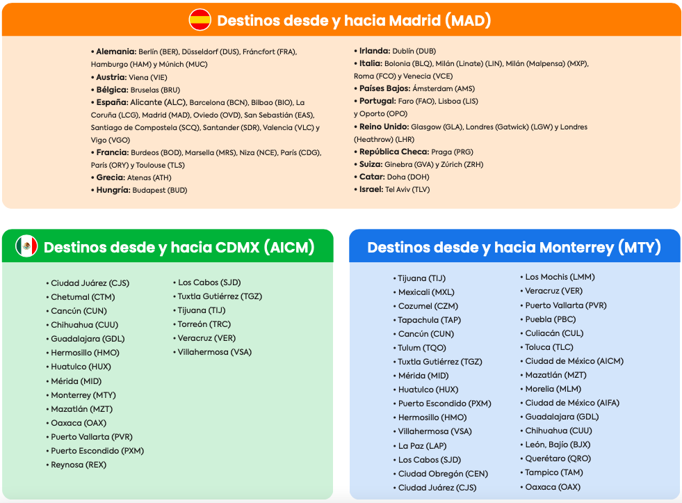 Estas son las rutas que llegan y salen desde el Aeropuerto Internacional de la Ciudad de México (AICM) y Monterrey (MTY), desde donde los pasajeros podrán conectar a Madrid y de ahí, a los destinos que Iberia ofrece desde el aeropuerto español: