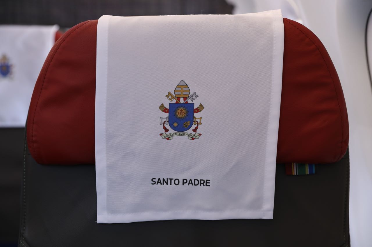 El avión que será el encargado de transportar al Papa por los cielos de Chile está acondicionando para recibirlo a él y a toda su comitiva. Por fuera, lleva un decal por ambos lados con el logo oficial del Papa Francisco y otro con el hashtag de su visita #ElVueloDeFrancisco. En su interior, habrán también cabezales y almohadas estampadas con el logo que lo representa en cada uno de los asientos, los nombres de cada pasajero, tarjetas de bienvenida y despedida, frazadas y plumones dependiendo el tipo de vuelo y un bolso con productos esenciales para el viaje.