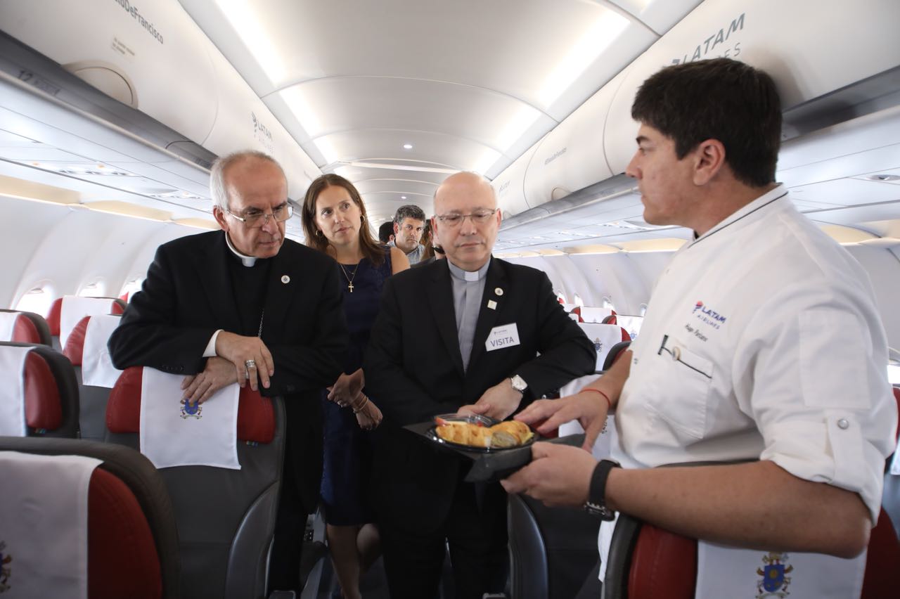 El servicio a bordo que se servirá durante los 4 trayectos desde Chile, fueron diseñados con productos que se sirven habitualmente en vuelos mayores a 7 horas o que se ofrecen a través de nuestro servicio a bordo para vuelos domésticos Mercado LATAM. "Siguiendo las recomendaciones del Vaticano de que se tratara de un menú único para todos los pasajeros, con alimentos sencillos y fáciles de transportar, es que diseñamos distintas bandejas según la duración del vuelo y su itinerario, las que incluyen alimentos frescos y propios de la región" afirma Hugo Pantano, Chef Ejecutivo de LATAM.