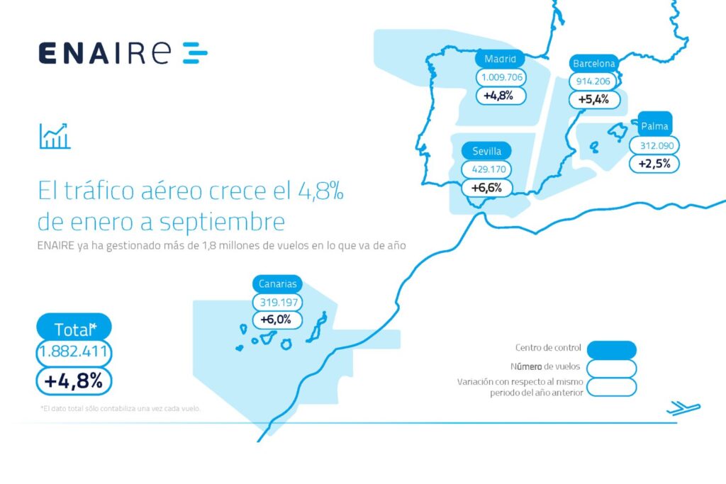 ENAIRE ha gestionado más de 1,8 millones de vuelos en los nueve primeros meses, cerca del 5% más que en 2024